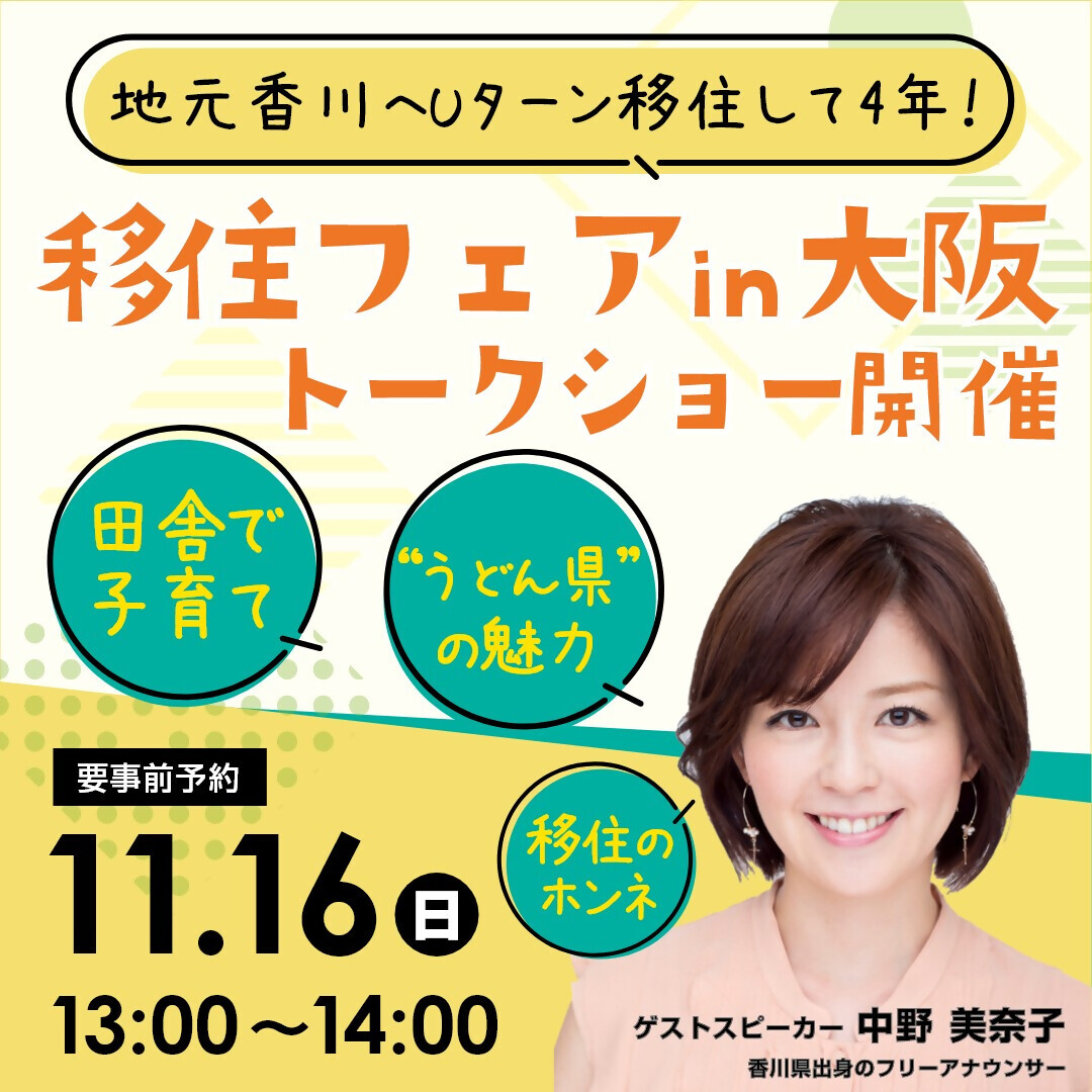 香川県内全市町の担当者や関西圏から香川に移住した先輩移住者が、かがわ暮らしの魅力を全力でお伝えする「香川県移住フェアin大阪」を大幅リニューアルし、3年ぶりに開催します! 香川県内全市町の自治体担当者による「移住に関する ...