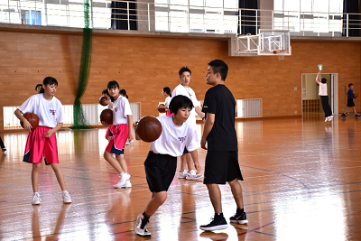 香川ファイブアローズのコーチら3人がさぬき南中学校のバスケットボール部を訪れ、指導を行いました。この活動は、県内のプロスポーツ選手やコーチが、部活動指導にやってくる香川県事業の一環です。